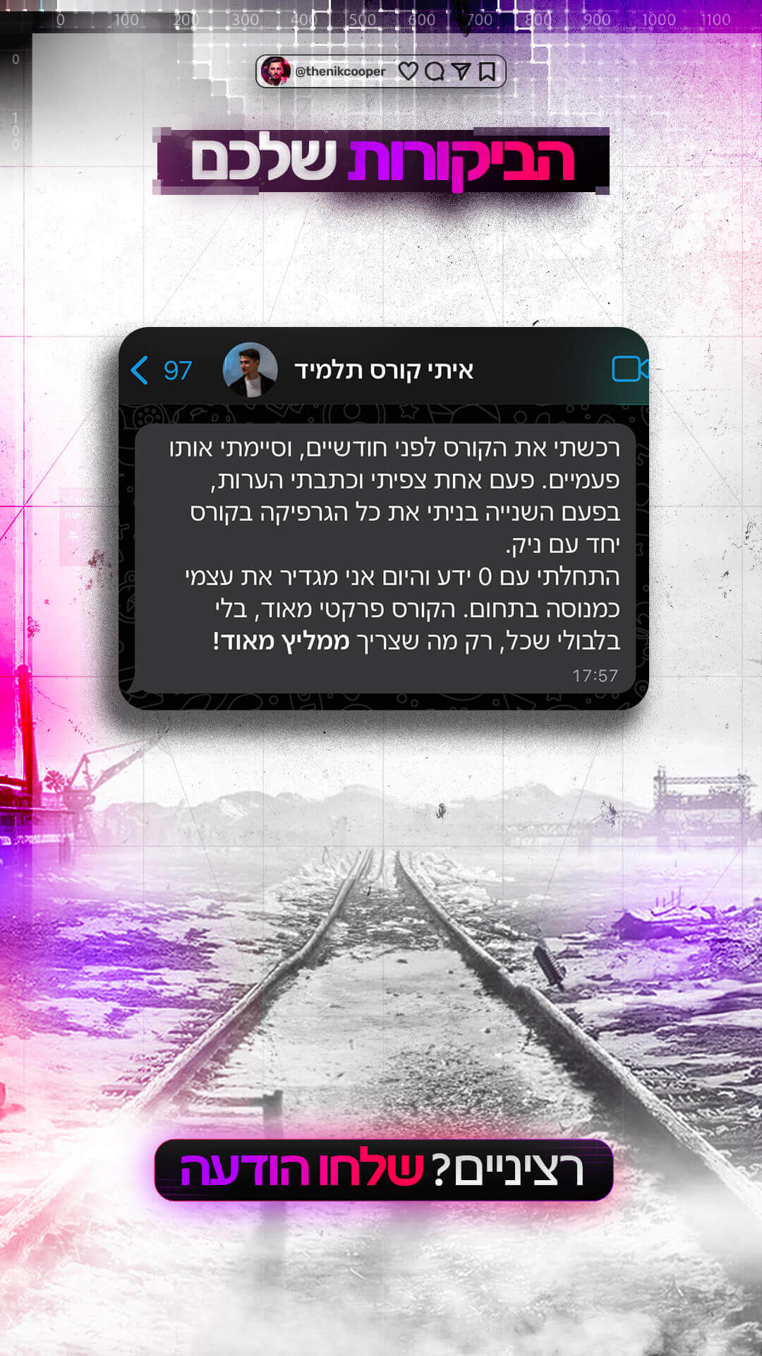 הקורס הזה עושה הפוך מכולם - כאן תראו איך עובדים באמת. 15 שנות ניסיון וחברה בע״מ בבעלותי דחוסים לפרקטיקה טהורה - קצר ולעניין: שיתוף מסך, דיבוב עם כתוביות ומעקב אחרי המקשים במקלדת, צעד צעד, מחשבה מחשבה.