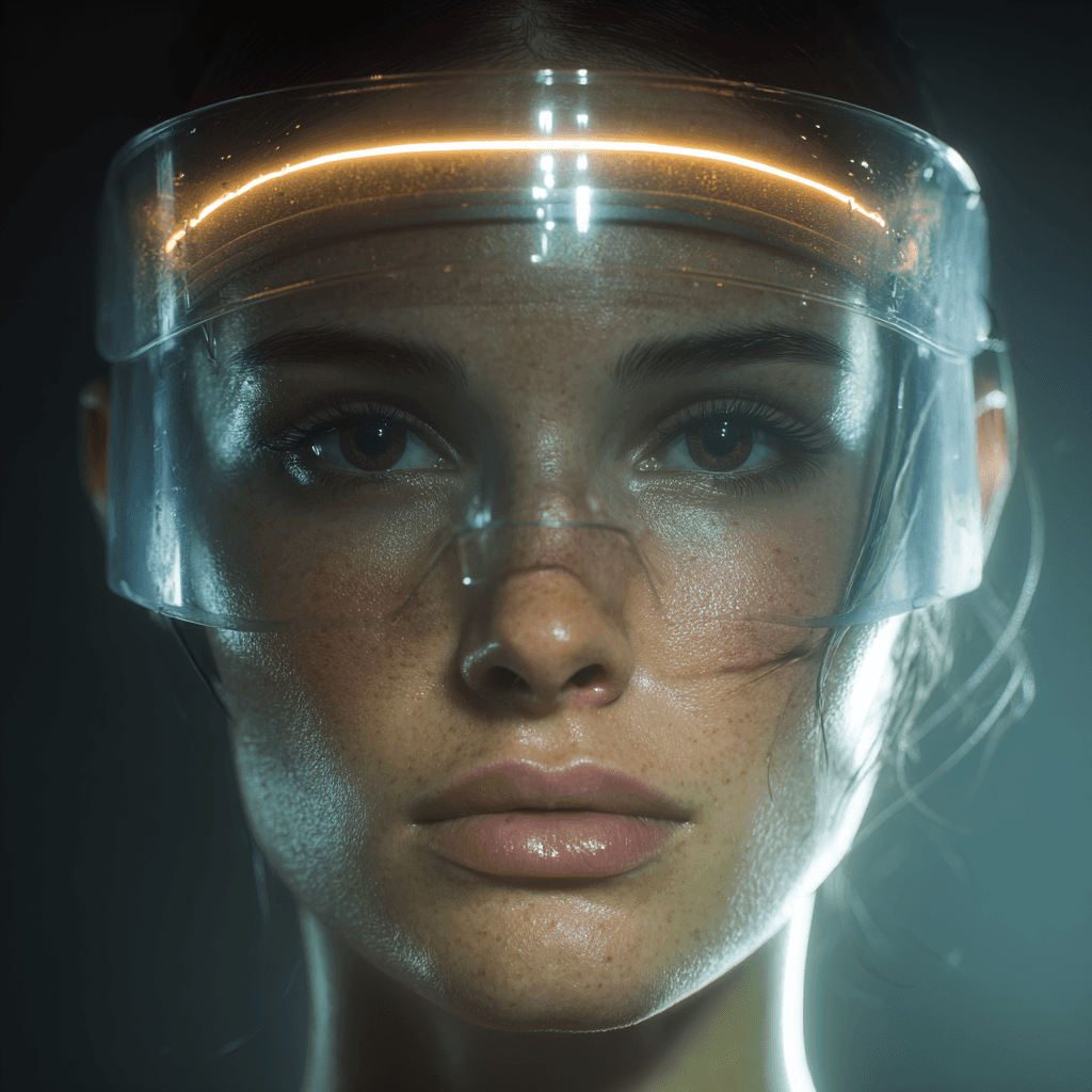 cyberpunk luxury portrait, human-AI hybrid wearing translucent smart visor, internal UI glow reflected on the face, minimalist yet powerful design, editorial photography style, dark background with subtle light fog, realistic skin textures, 8k, cinematic mood