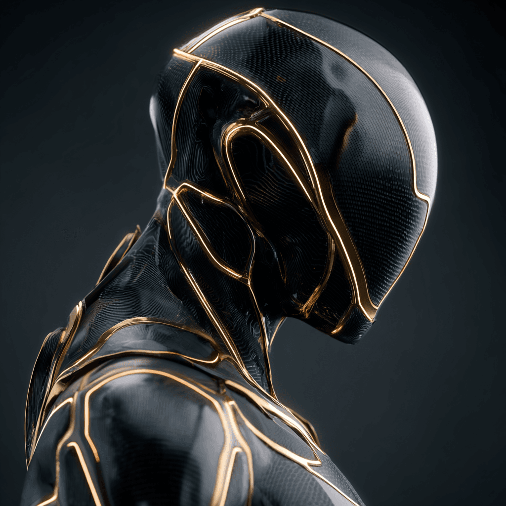 luxury sci-fi humanoid figure, black obsidian armor with gold light seams, smooth futuristic silhouette, soft neon reflections, side angle portrait, high-fashion tech vibe, dramatic shadows, dark background, hyperreal render, no illustration style