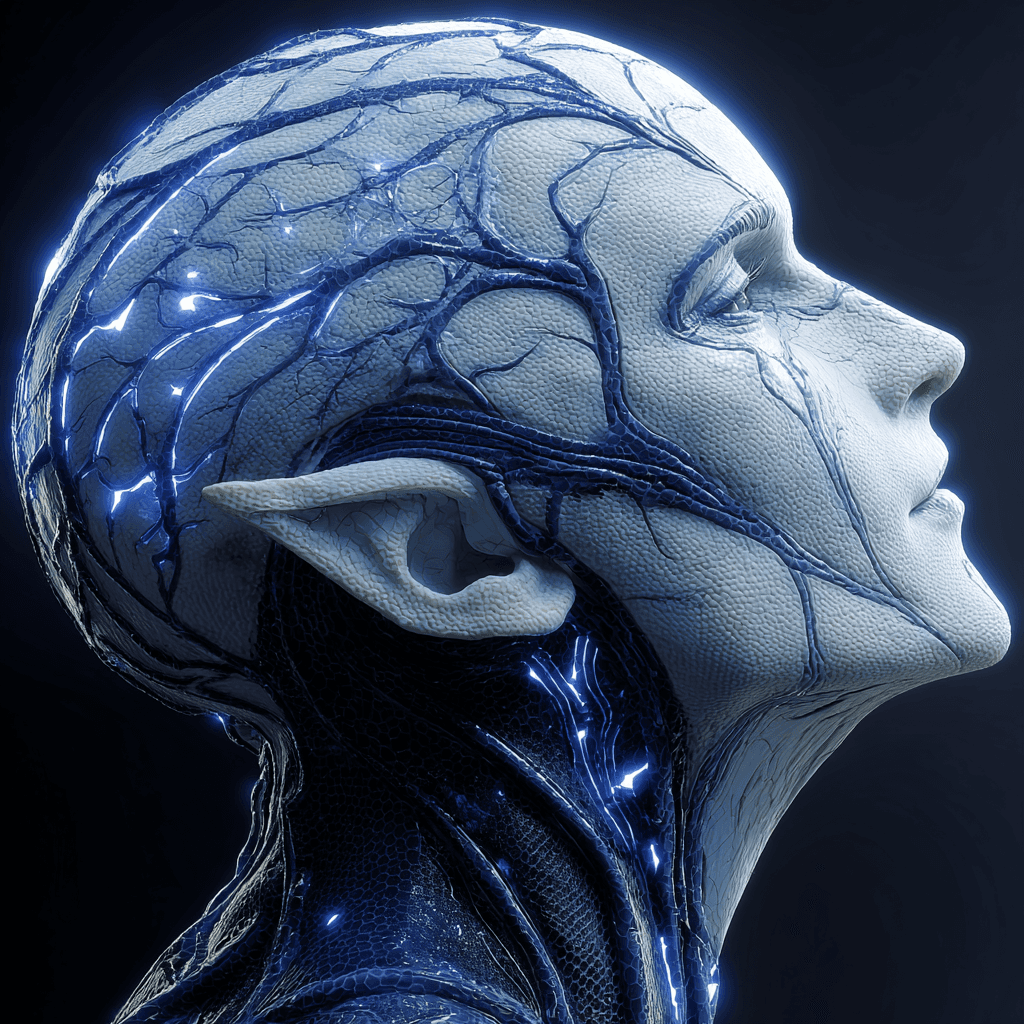 Luxury cybernetic headshot, bioluminescent skin details, glowing veins under matte surface, premium sci-fi look, soft rim lighting, dark background, minimalistic yet powerful, ultra-sharp, realistic materials, no cartoon