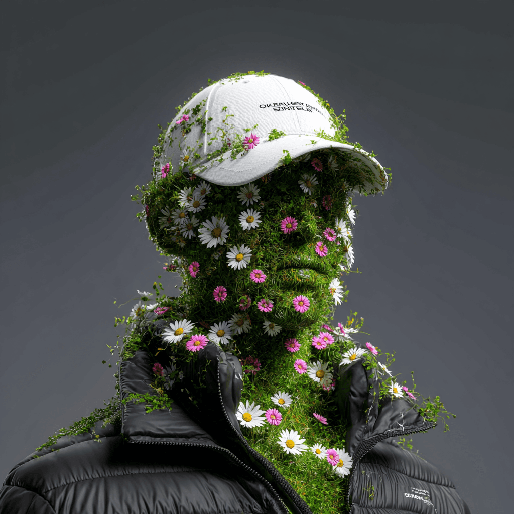 eco fashion portrait of a human bust whose all face and neck is covered with lush green grass and small daises with pink centered. blending nature and humanity. The subject wears a white baseball cap with minimal black typography and black puffer jacket. Ultra realistic, in the style of Unreal Engine. Studio Quality, ultra realist.c
