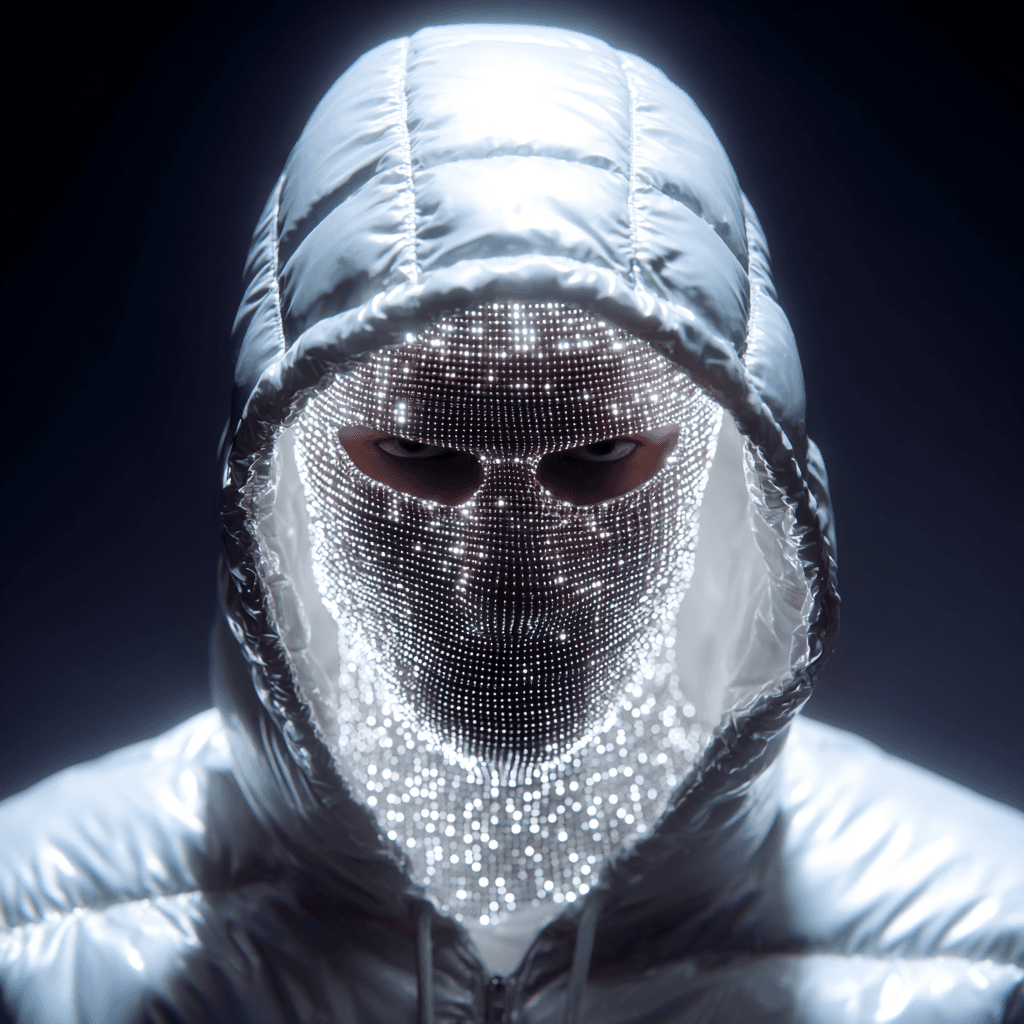 cinematic fashion portrait of a mysterious person wearing a white balaclava covered with small led lights. only intense eyes visible. The subject is dressed in a glossy white puffer jacket, surrounded by dark atmosphere. Moody cinematic lighting, shallow depth of field. Subject is in the middle of the portrait, full upper body portrait, high contrast. In the style of Unreal engine, ultra realistic high definition portrait photo.