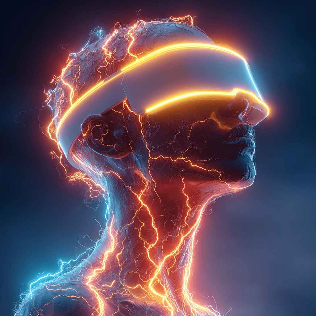 Electric cyber avatar in Bitmoji style, glowing lightning veins running across the face and neck, futuristic neon electric visor sunglasses pulsing blue and yellow energy, sparks and plasma arcs surrounding the head, charged atmosphere, dark cyberpunk background with intense electric blue and purple neon lights, ultra-detailed 3D character render, vibrant colors, cinematic glow, digital art, premium stylized aesthetic