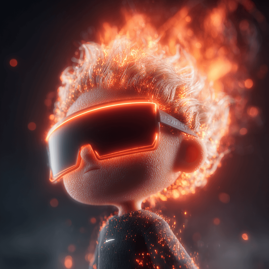 super cool fire-powered Bitmoji-style avatar, head engulfed in stylized neon flames, molten energy flowing through the skin, futuristic heat-visor sunglasses glowing orange and red, ember particles floating in the air, confident swagger pose, cyberpunk fire aesthetic, dark background with red-orange neon lights, ultra-detailed 3D render, vibrant colors, cinematic lighting, digital art, high contrast, premium stylized look
