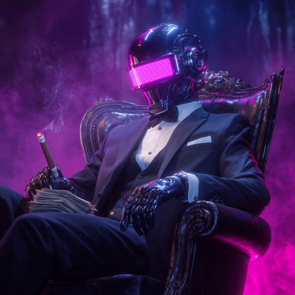 A futuristic cyber mafia boss sitting confidently in a luxurious leather armchair, wearing a tailored dark suit and vest, black gloves, and a sleek high-tech helmet with a glowing neon visor. Purple and magenta cinematic lighting, mysterious dark forest background with fog and smoke, cyberpunk noir atmosphere. Holding a stack of cash and a cigar, power and control vibe. Ultra-detailed, hyper-realistic, dramatic shadows, volumetric lighting, shallow depth of field, cinematic composition, high contrast, 8K, concept art, digital art, unreal engine style