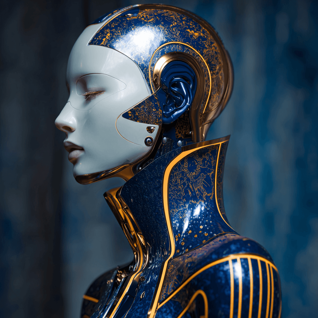 high-fashion robotic muse, smooth porcelain face with chromed edges, glowing linear patterns across neck and shoulders, futuristic runway aesthetic, Vogue sci-fi editorial, deep indigo and gold highlights, ultra-detailed, photorealistic lighting
