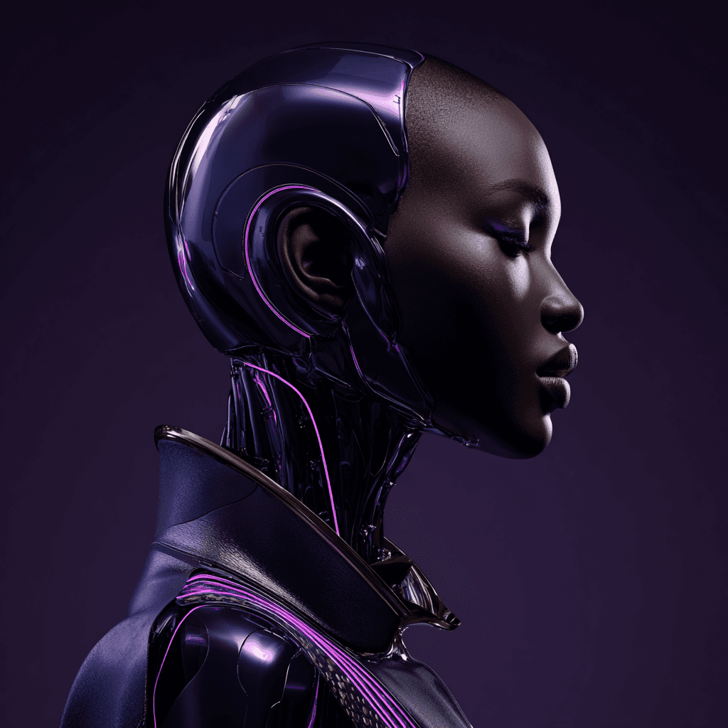 Ultra-premium futuristic android portrait, glossy ceramic and liquid chrome materials, seamless body panels, soft internal light veins, editorial side profile, luxury fashion tech aesthetic, Apple Vision Pro meets haute couture, dark studio background, deep violet highlights, hyperrealistic, cinematic lighting, no cartoon